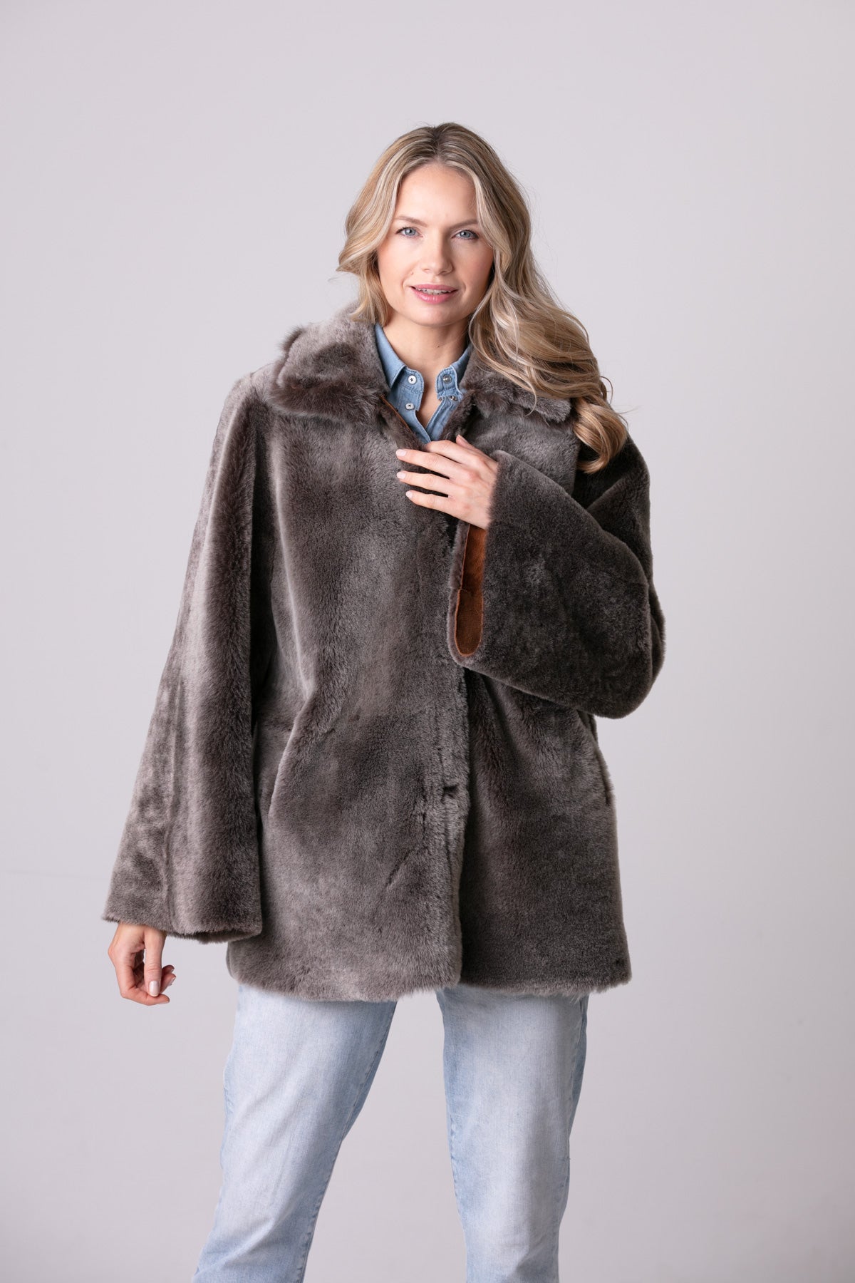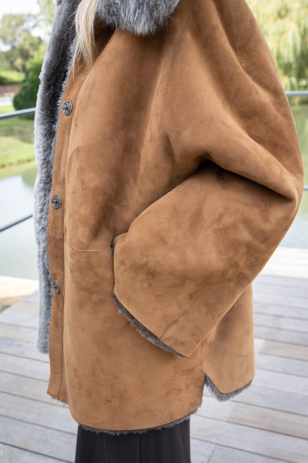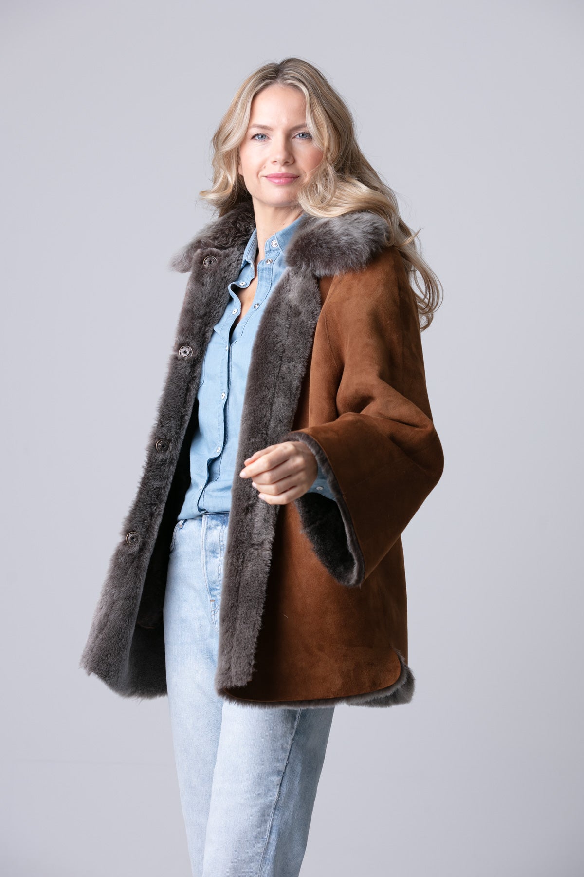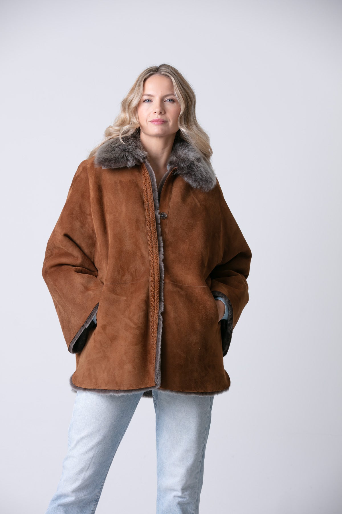 Featuring the most amazing intricate embroidery edging detail which is noted all the way down the front on the tan side, giving you so much luxurious texture against the luscious minky grey merino shearling.