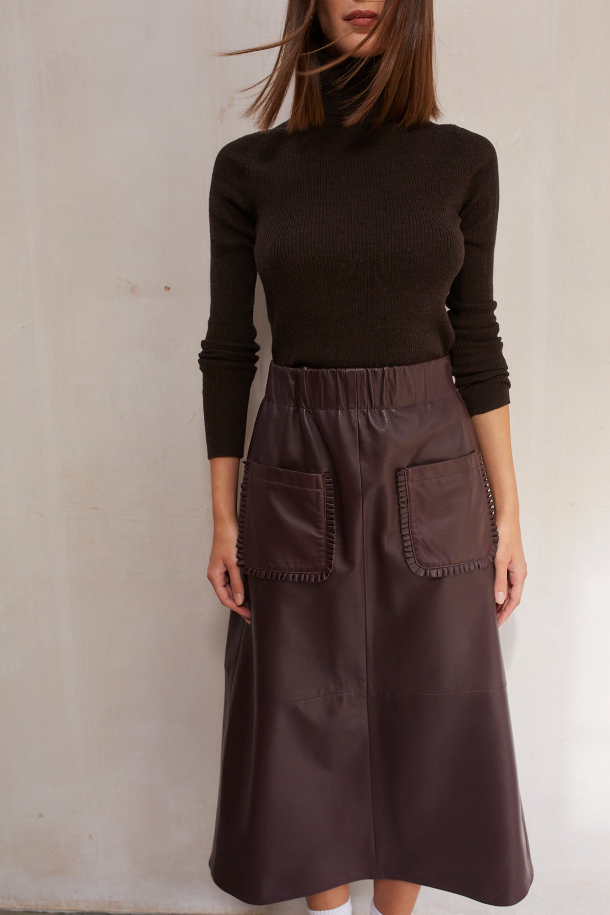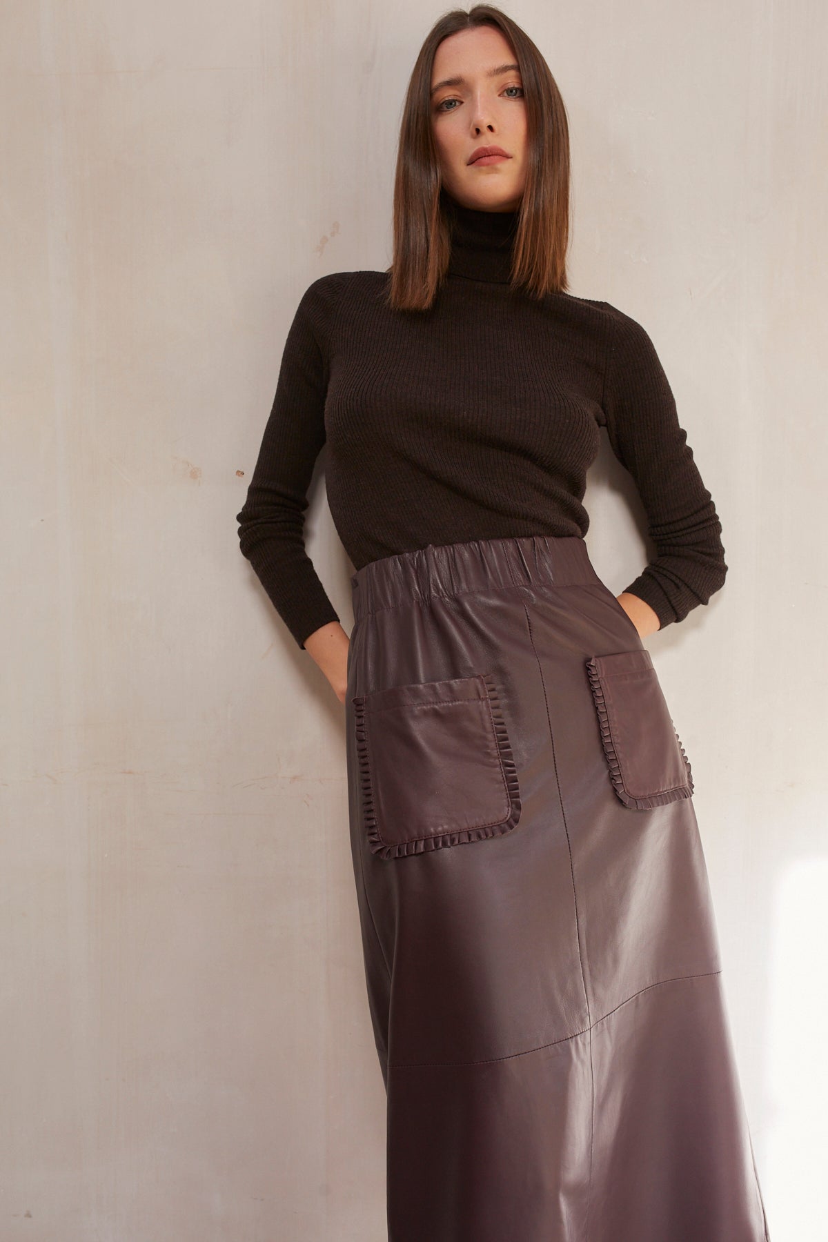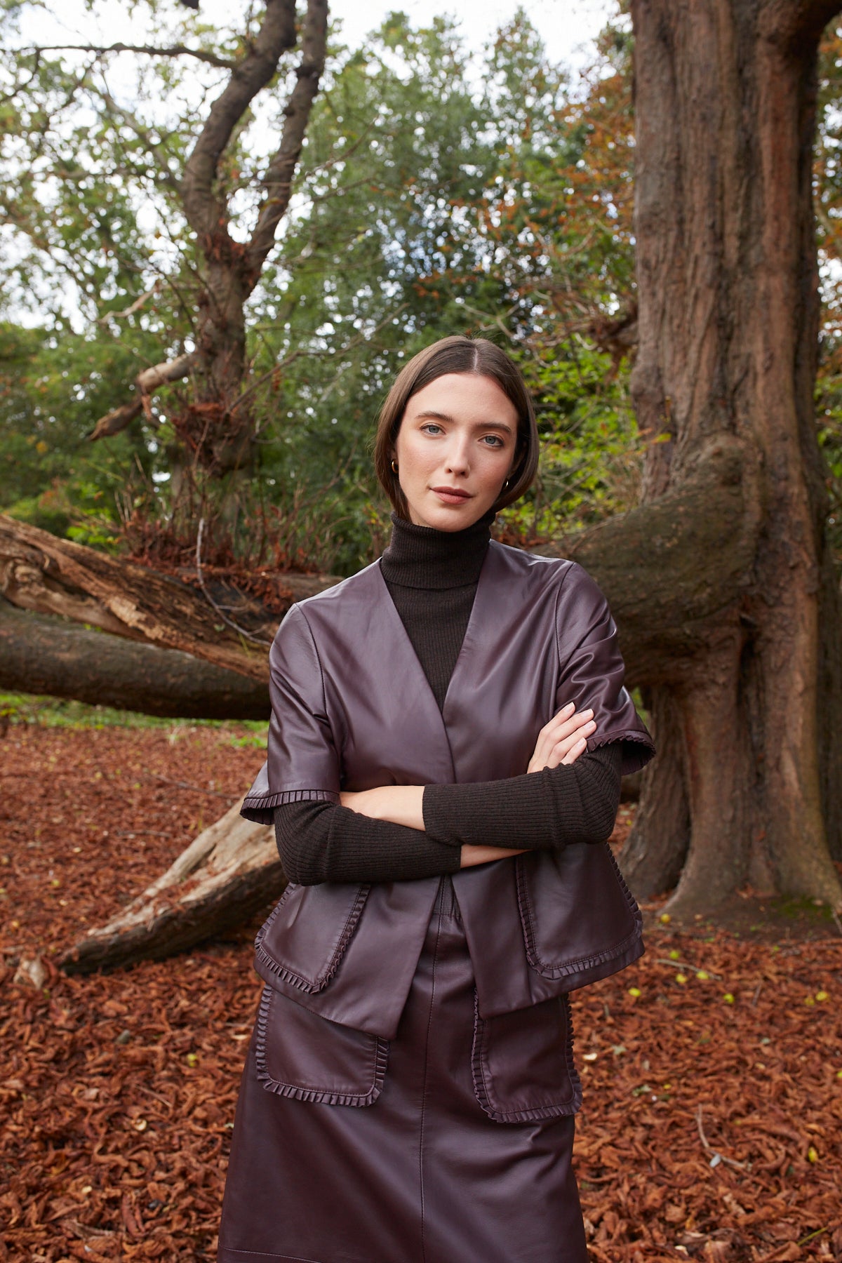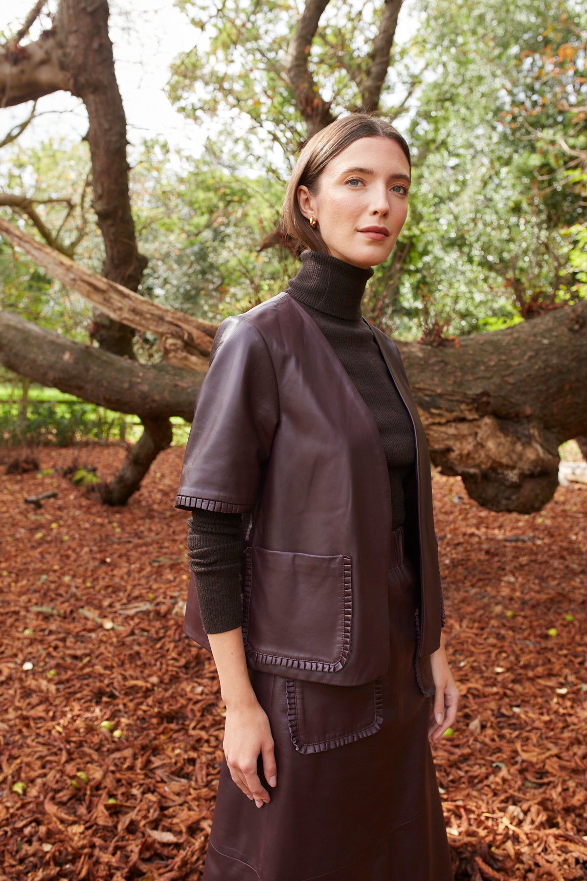 The overall fit and shape is based on our ever-popular Jeanette Jacket, but we have added the pleated leather details to the pocket and cuff as featured on our best-selling Phoebe leather skirt.