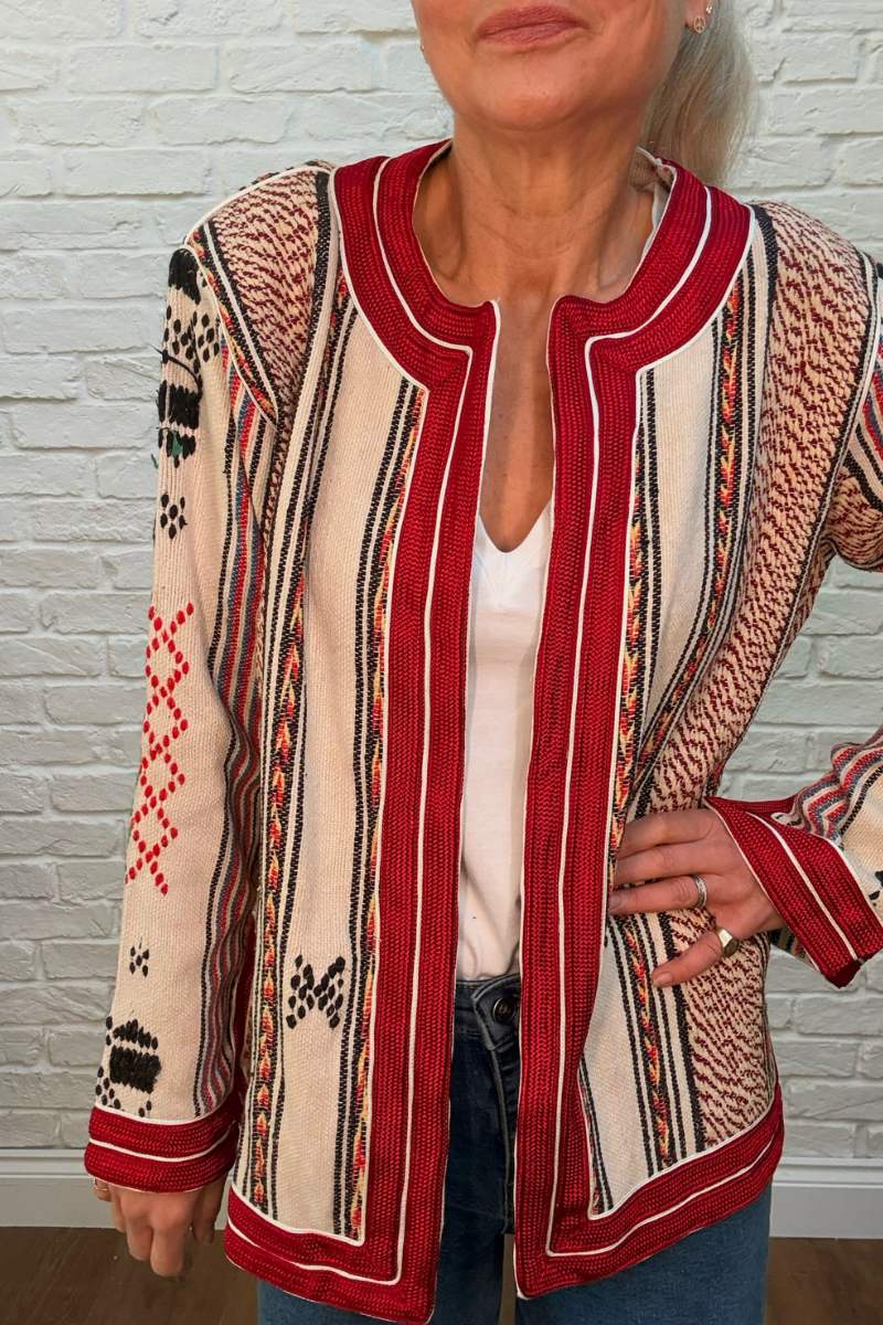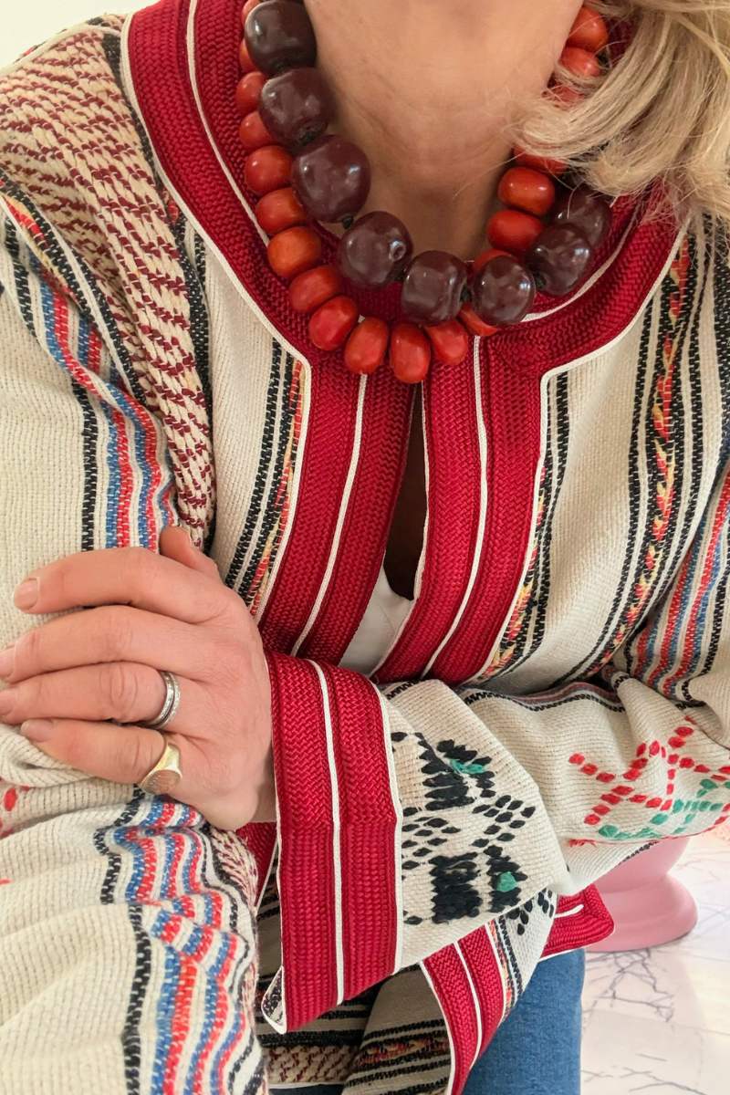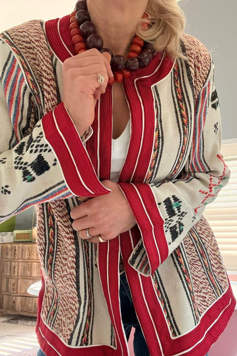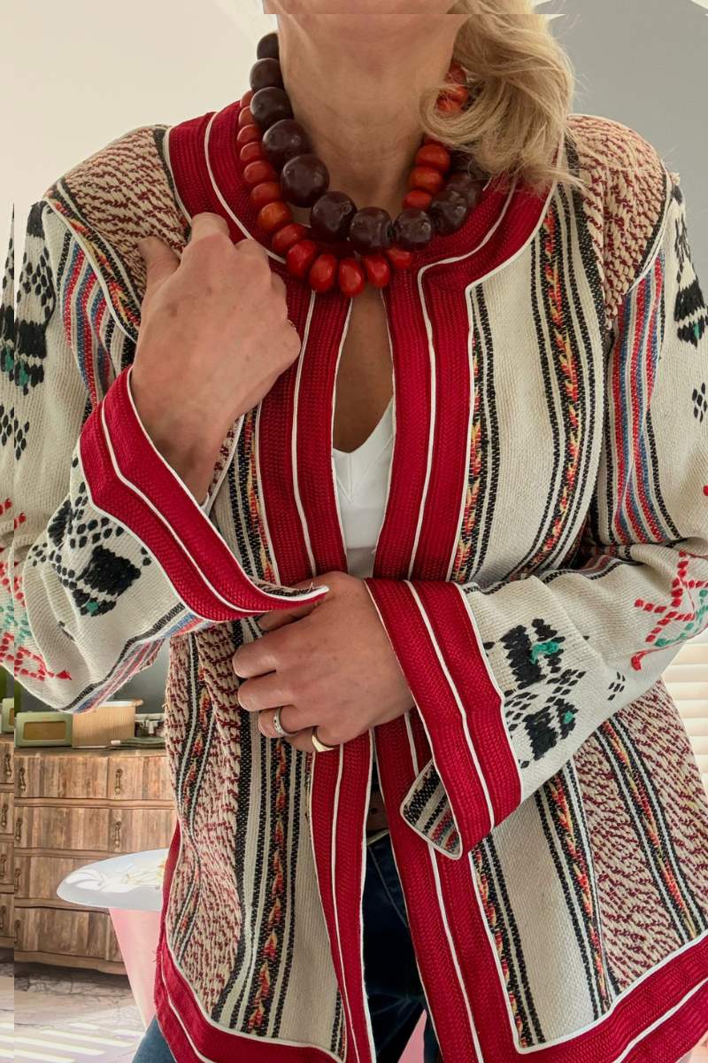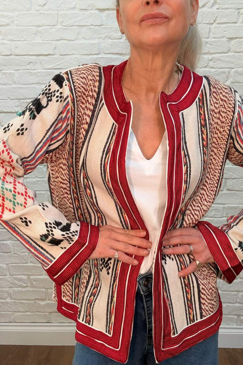 So proud to launch our one of a kind “Laurent” jacket. This forever classic unique vintage piece is trimmed with red silk and stunning details. Each jacket is unique with limited availability, sourced from Morocco.
